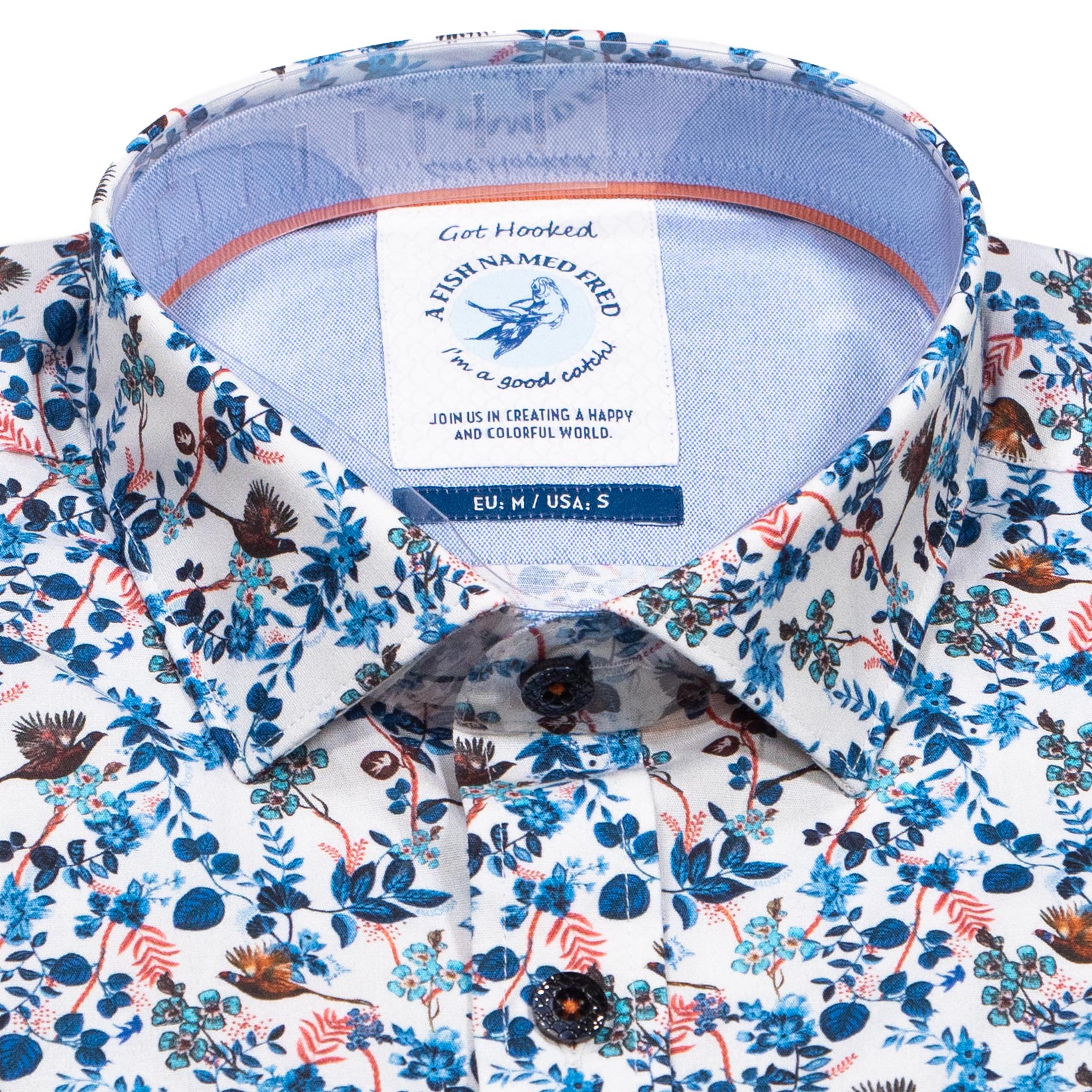 A Fish Named Fred white shirt with autumn pheasants and blue foliage. A great design with lots of intricate detail.