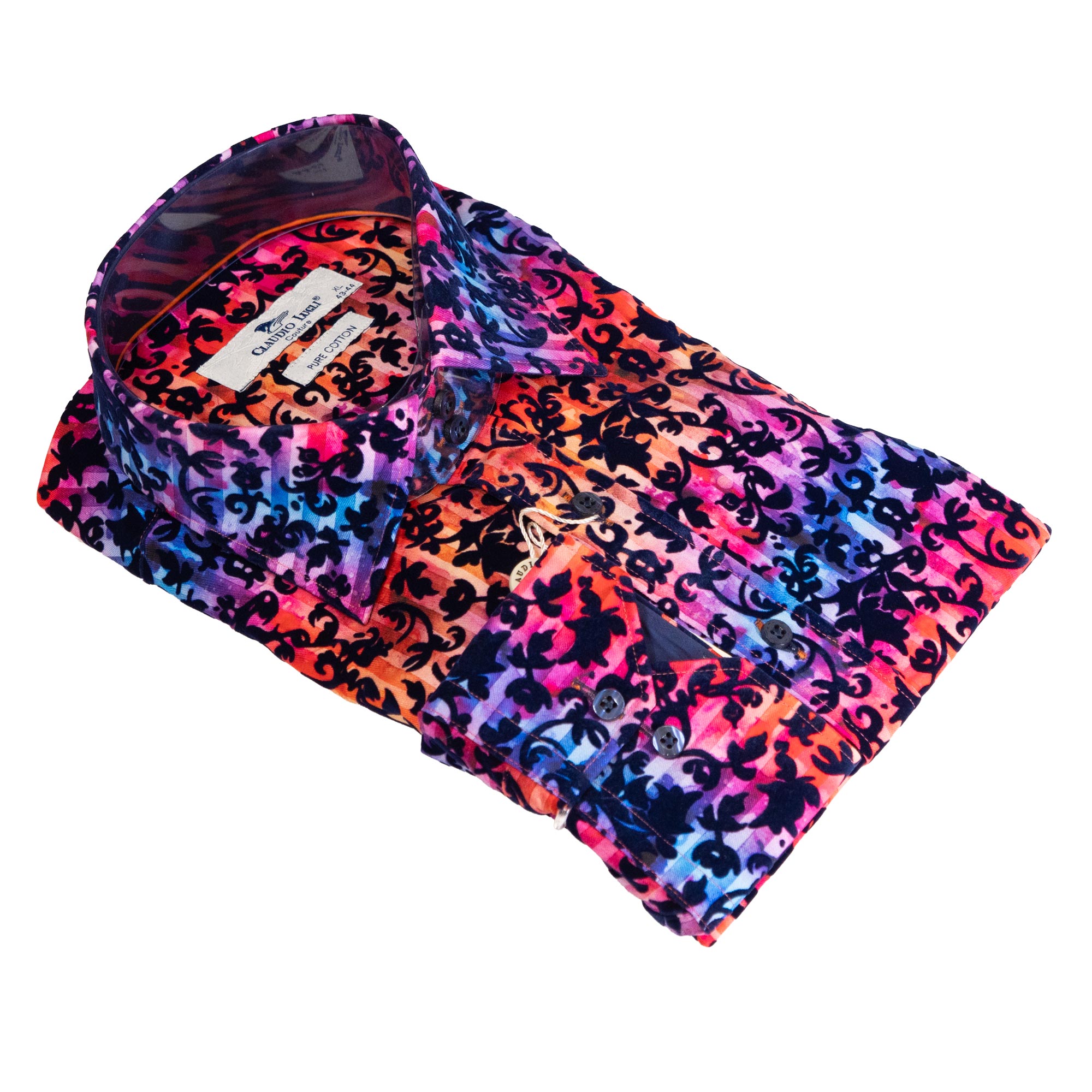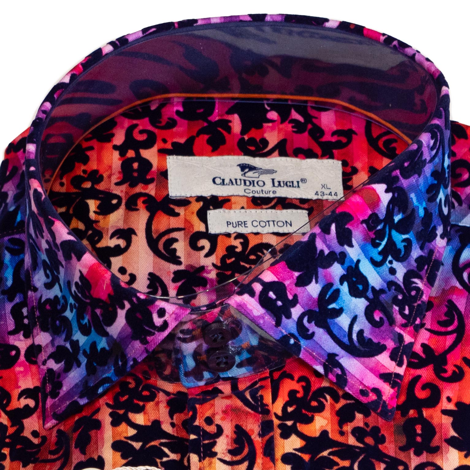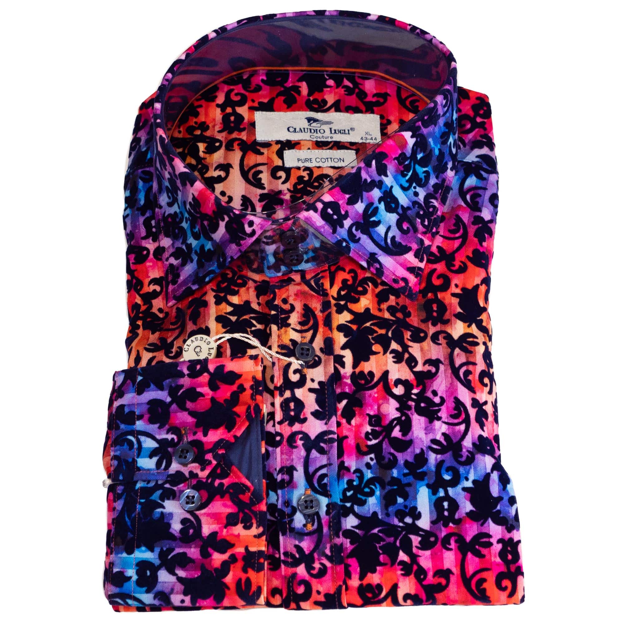 Claudio Lugli shirt in red blue and orange with a black flocking floral design with a luxury textured finish. A very special shirt form Gabucci Bath