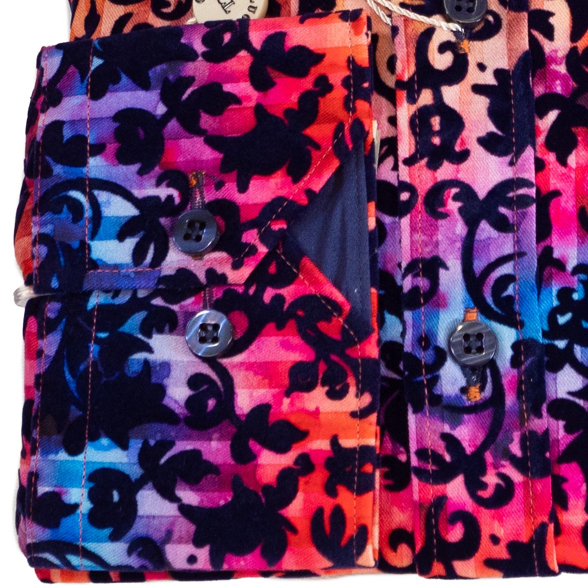 Claudio Lugli shirt in red blue and orange with a black flocking floral design with a luxury textured finish. Flocking adds a raised velvety texture where applied and Claudio Lugli are very skilled at making it stand out as key elements in their designs. A very special shirt form Gabucci Bath