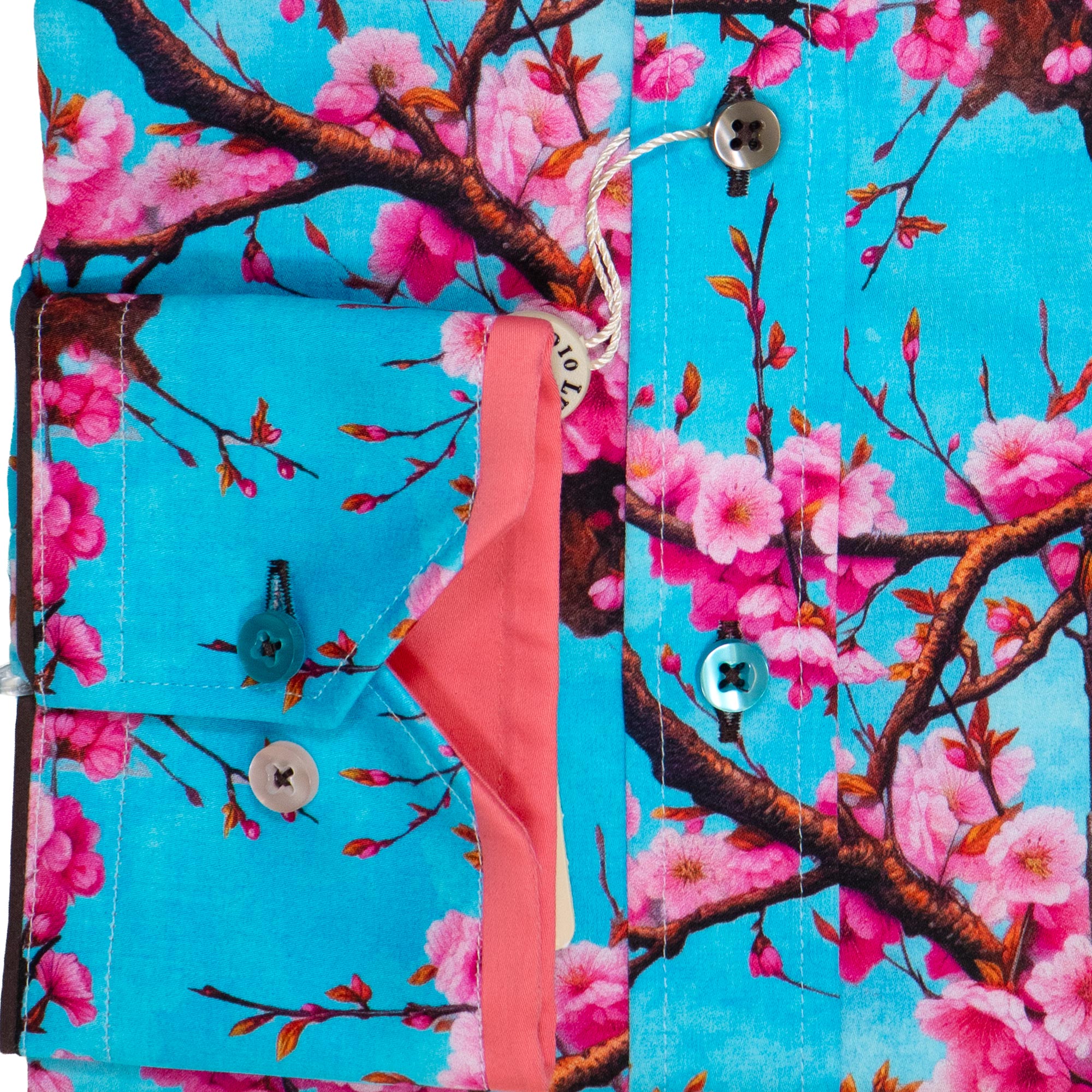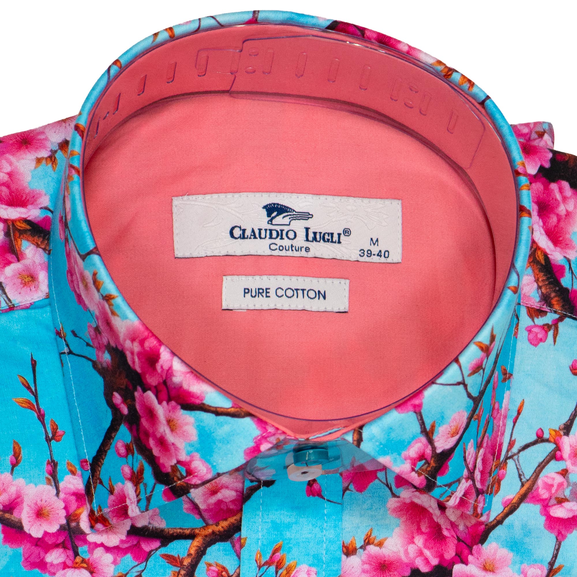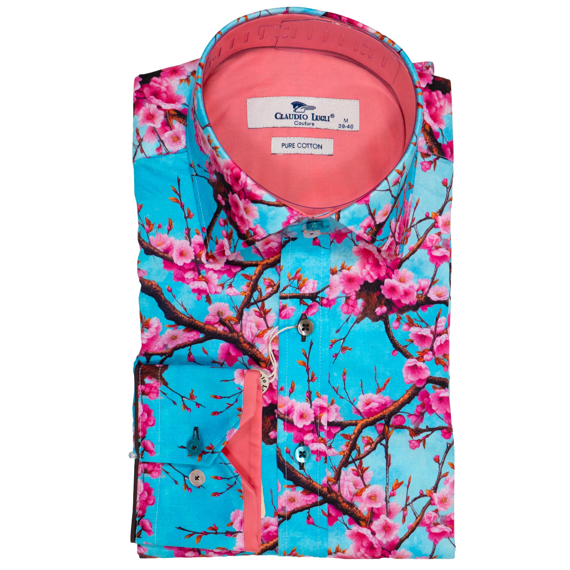 Claudio Lugli shirt in sky blue with large colourful pink flowers. The design is stunning and perfect for holidays, leisure and making an impression wherever you go, from Gabucci Bath