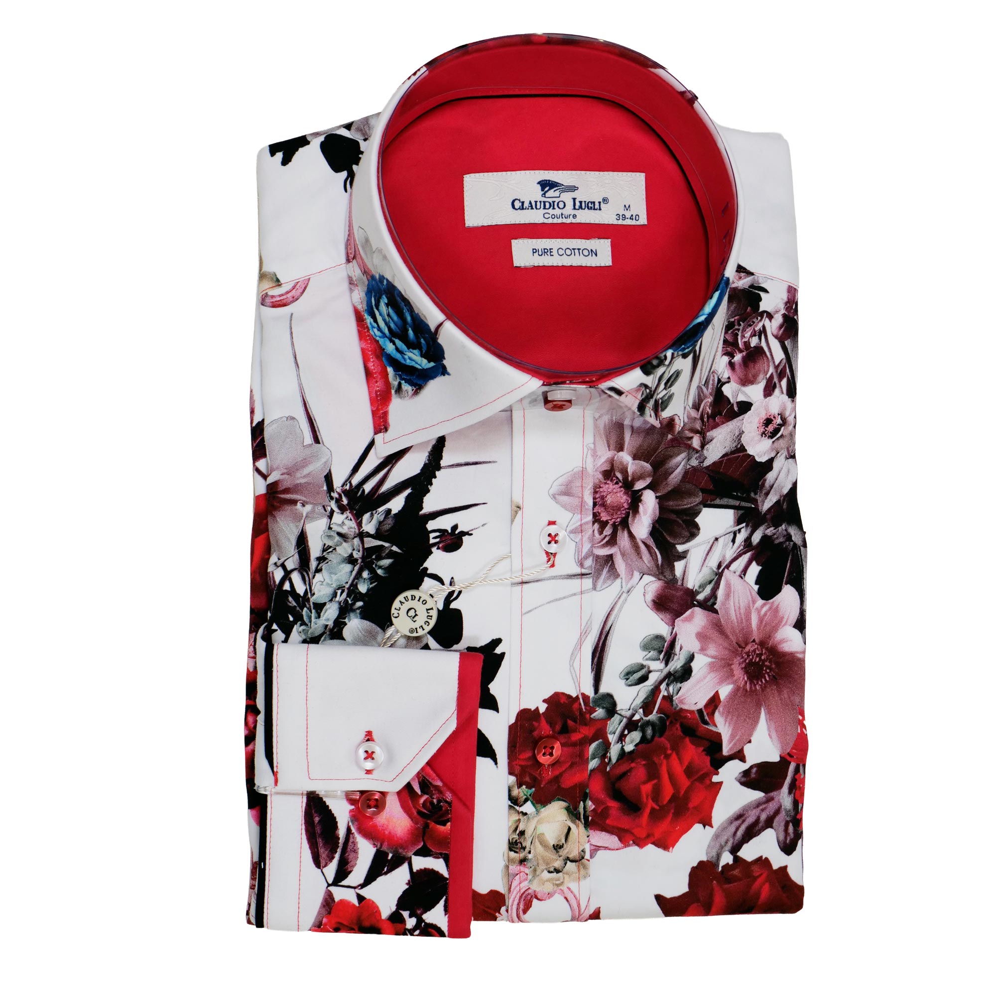Claudio Lugli shirt in white with large colourful red pink and blue roses. The design is fun and stylish with a fabulous rose design. The red design carries through to the lining, from Gabucci Bath
