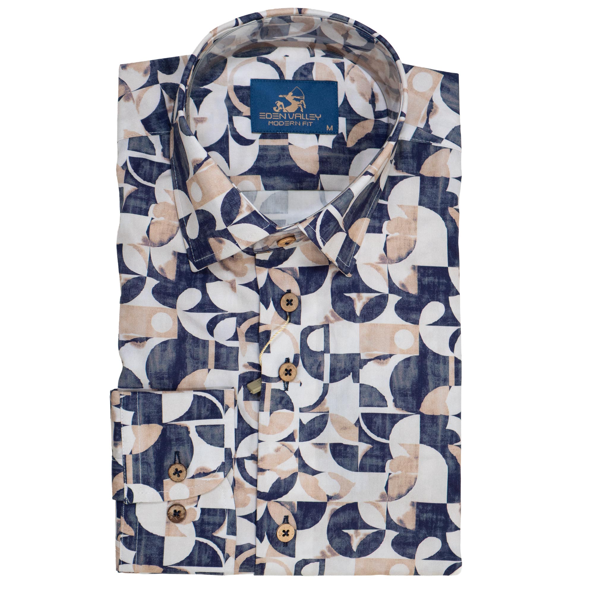 Eden Valley white shirt with beige and blue shapes foliage inspired from Gabucci Menswear, Bath