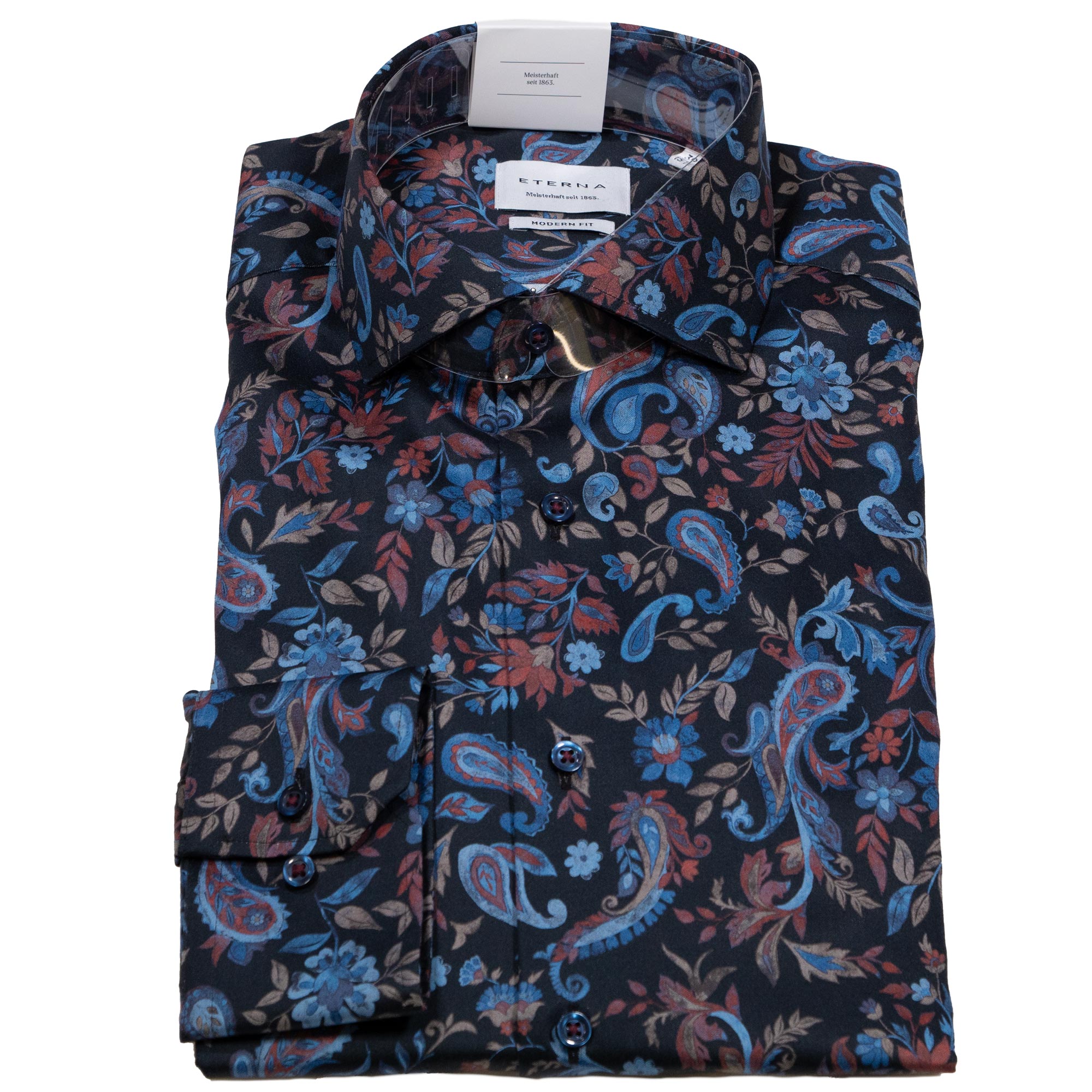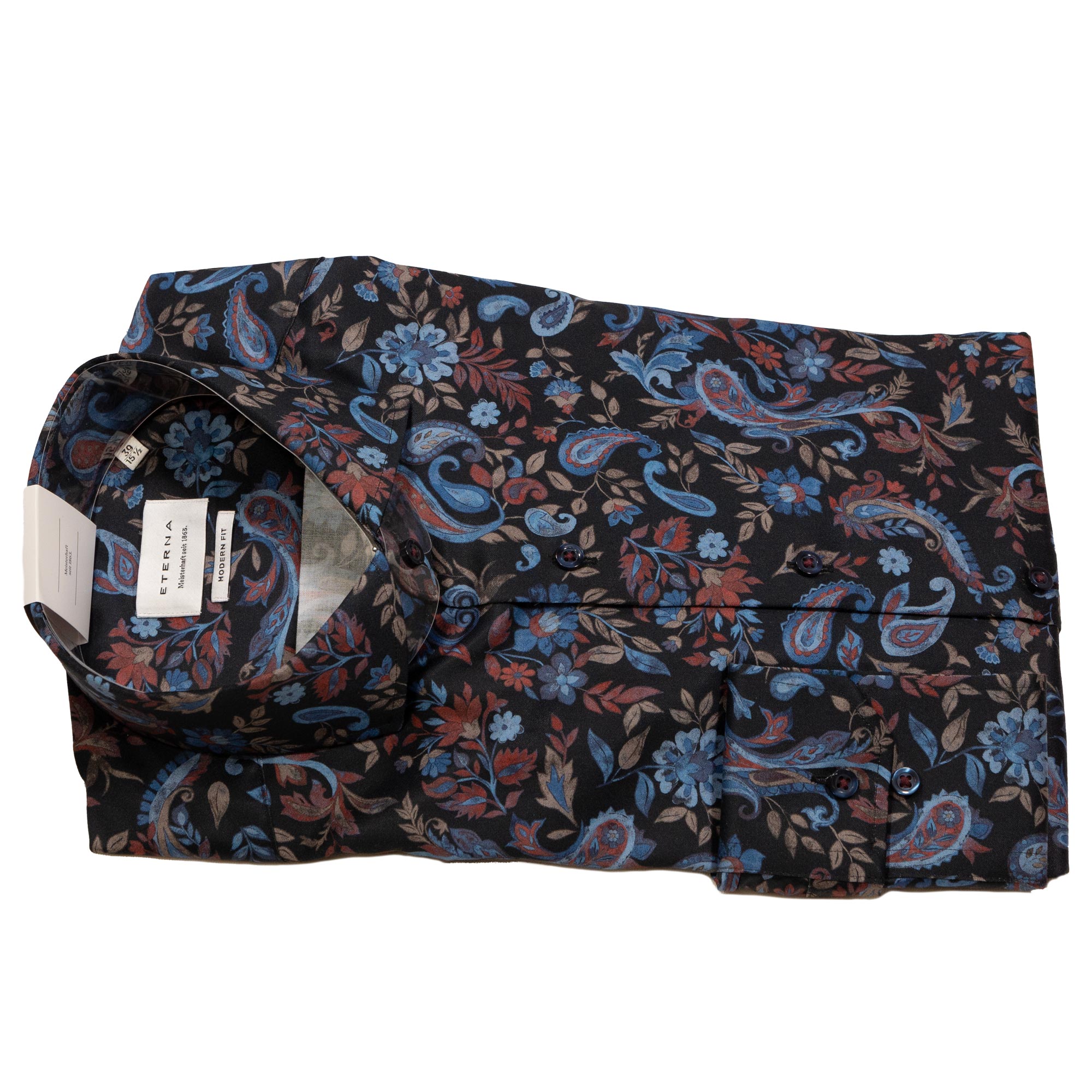 Eterna black shirt with large blue and red foliage, from Gabucci Bath. The shirt has a great design that will stand out in any company.