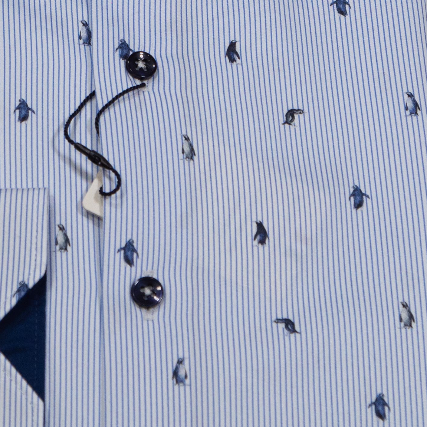 Giordano striped blue shirt with small blue penguins, from Gabucci Menswear in Bath